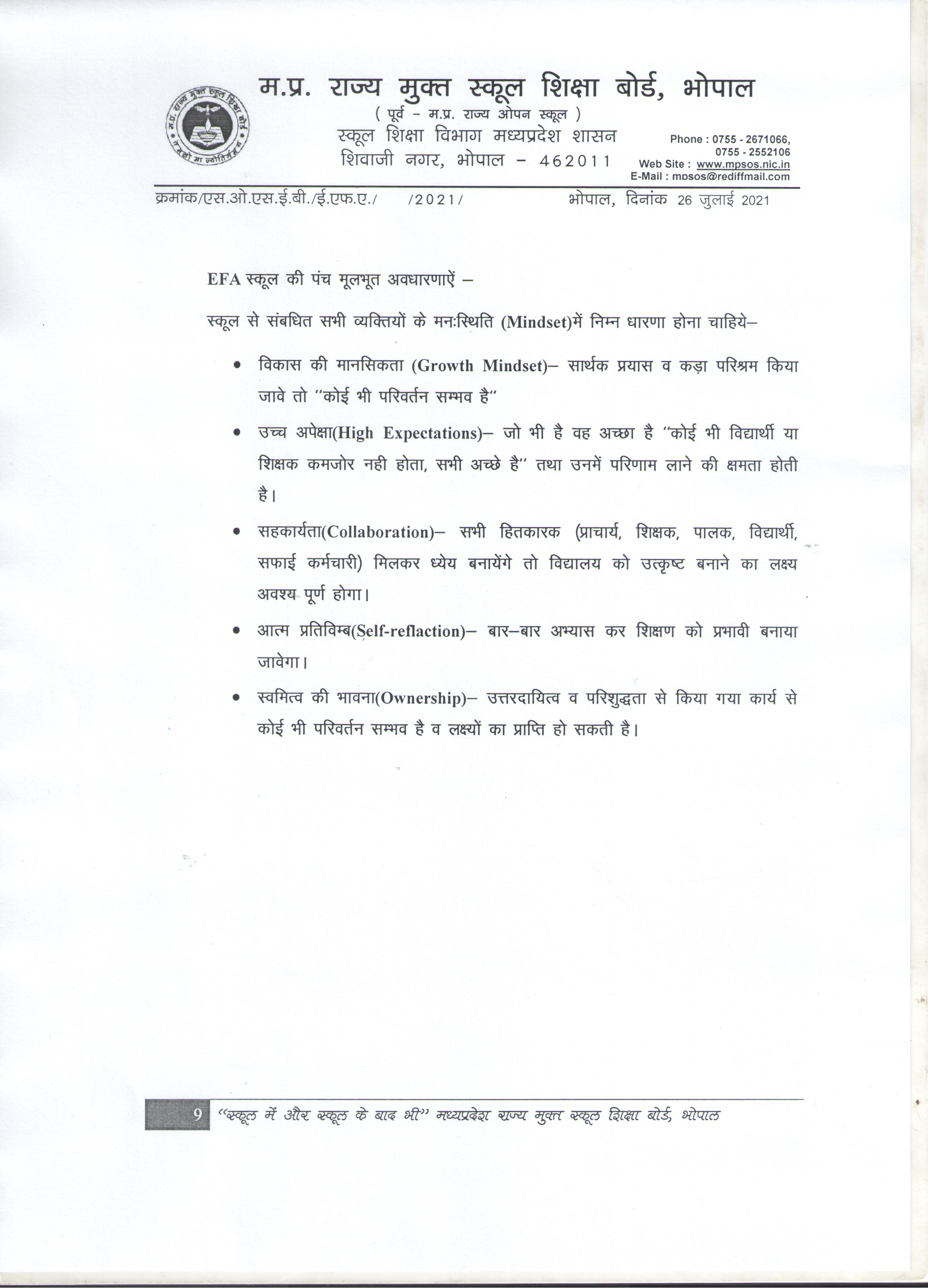 The Madhya Pradesh State Open School Education Board, has identified one Government Higher secondary school located at district headquarter and proposed to develop it as world class school. The EFA school shall have classes from LKG (Anji play school pattern with Sanskrit medium) to 12th standard. Every shall have fully equipped computer lab having 40 computers with latest software. EFA school are first in country to start Artificial intelligence as one of compulsory subject from class 8th. The STREAM lab and academic facility to prepare for PISA test are other attraction.